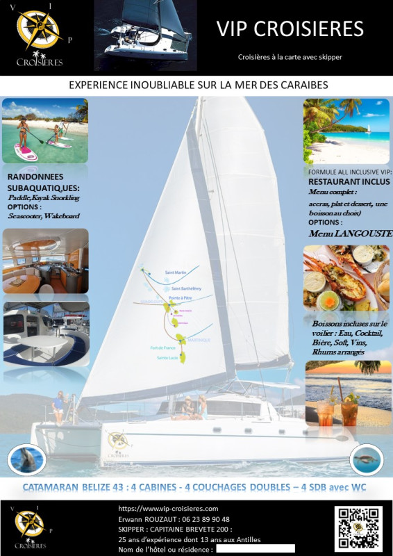 En fonction de vos évènements comme un anniversaire, un enterrement de vie de garçon ou de fille, une lune de miel, un repas d'entreprises, ou à l'occasion d'une croisière d'évasion pendant vos vacances. Je me ferais un plaisir de vous accompagner pour vous faire découvrir les meilleurs spots des Caraïbes.
